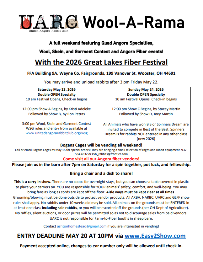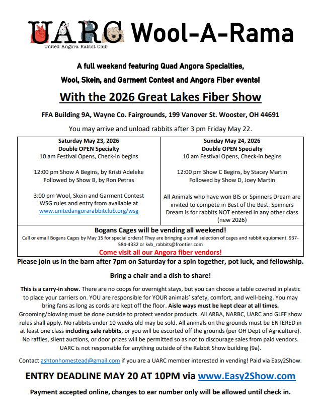 In spring tradition, Wooster, Ohio becomes host to Great Lakes Fiber Festival on Memorial weekend. Angora rabbit breeders from across the Midwest gather to display and show the breeds in four sanctioned rabbit shows hosted by UARC. The Angora take over an entire barn of the festival with display and Angora yarn and fiber vendors, open to the public attending the fiber festival.